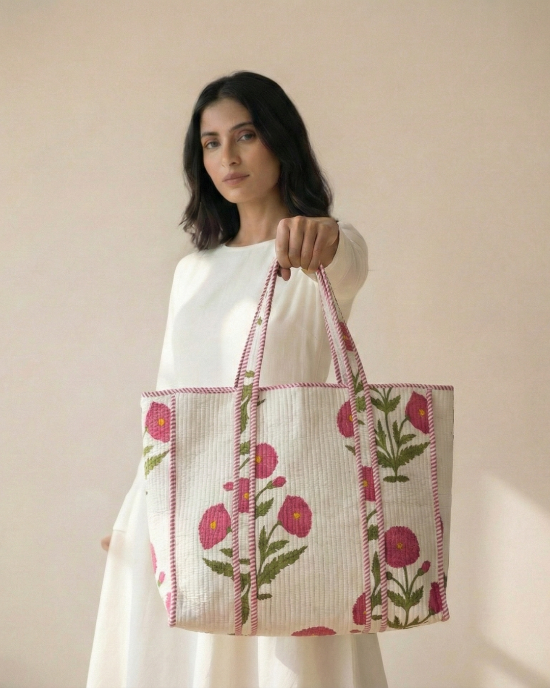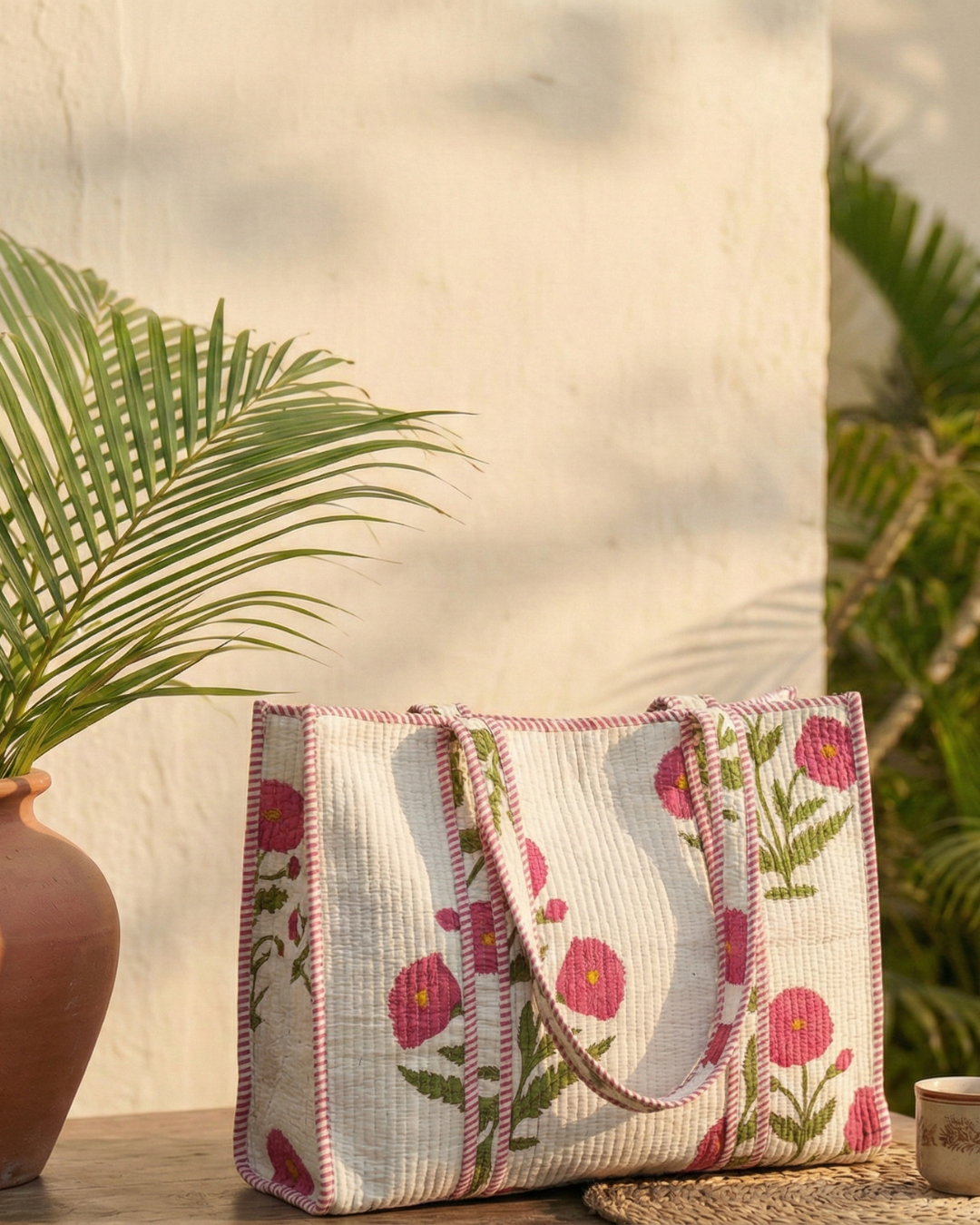 Finished with sturdy, comfortable handles, it’s perfect for workdays, casual outings, shopping runs, or short getaways. Crafted using traditional handblock printing, each tote carries a touch of artisanal beauty, making it as unique as your style.