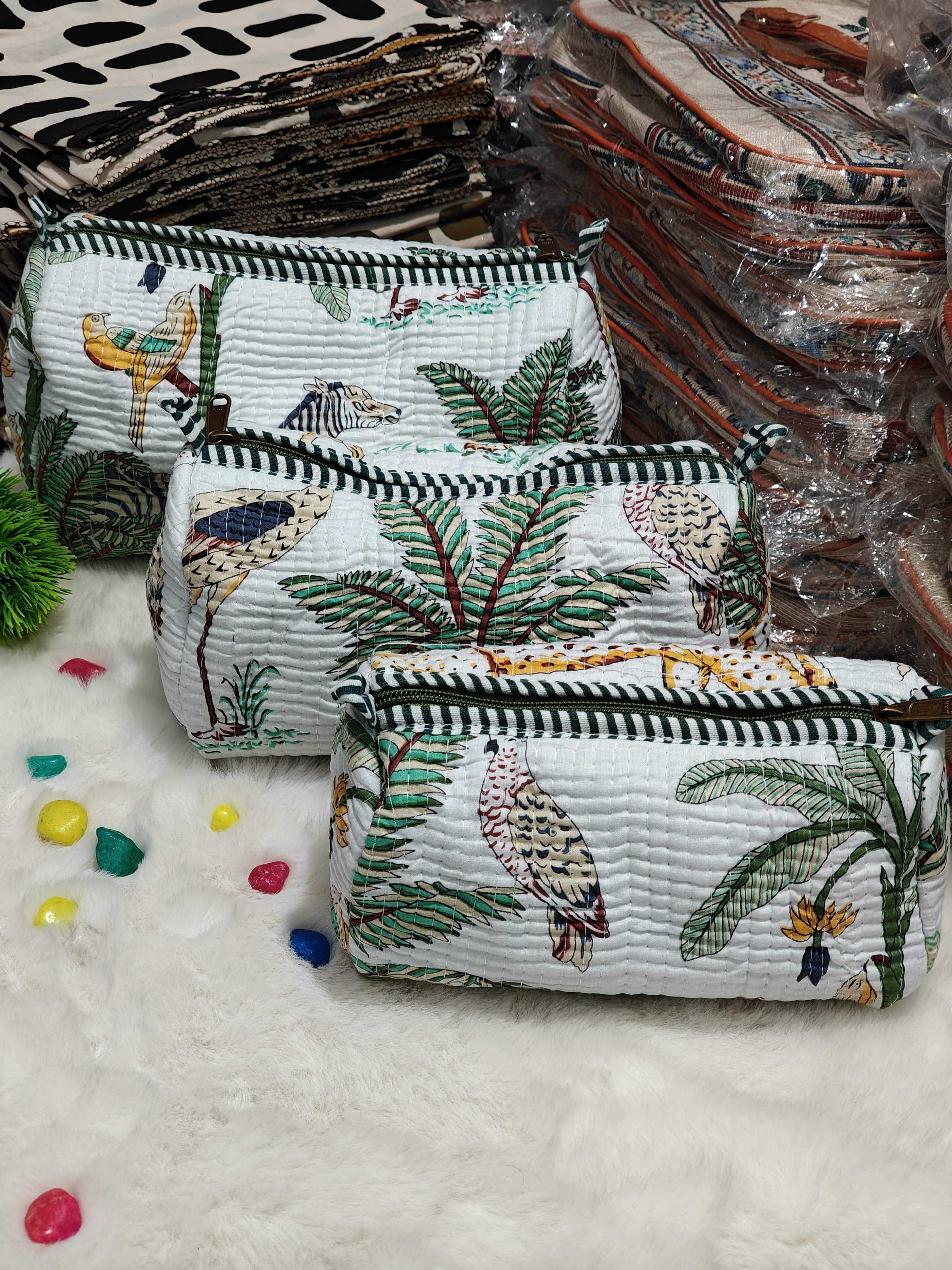 This set of three quilted cotton pouches is thoughtfully handcrafted to combine functionality with everyday elegance. Designed in three practical sizes, these pouches are perfect for organizing travel essentials or storing makeup, stationery, jewellery, and daily accessories.