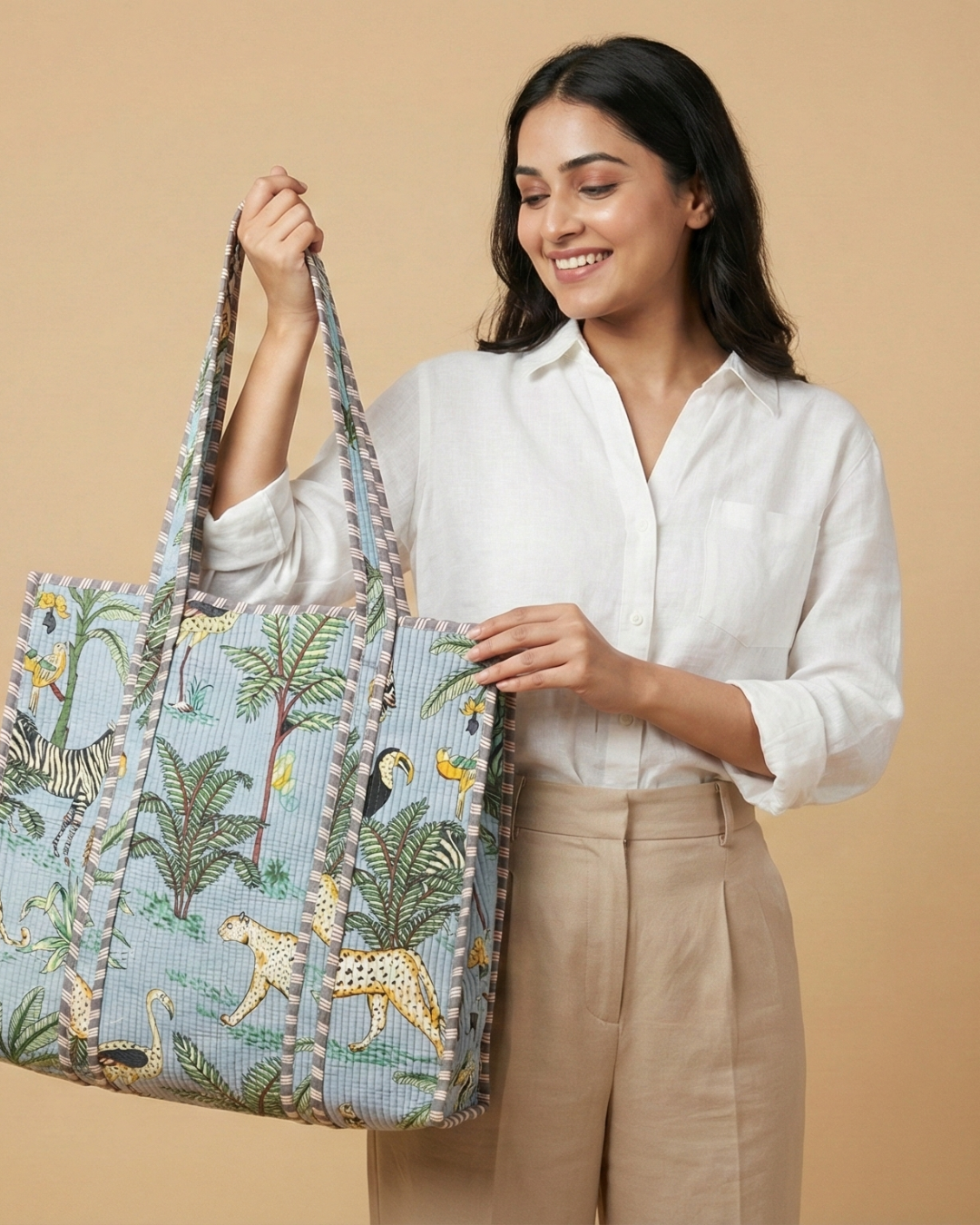 Finished with sturdy, comfortable handles, it’s perfect for workdays, casual outings, shopping runs, or short getaways. Crafted using traditional handblock printing, each tote carries a touch of artisanal beauty, making it as unique as your style.
