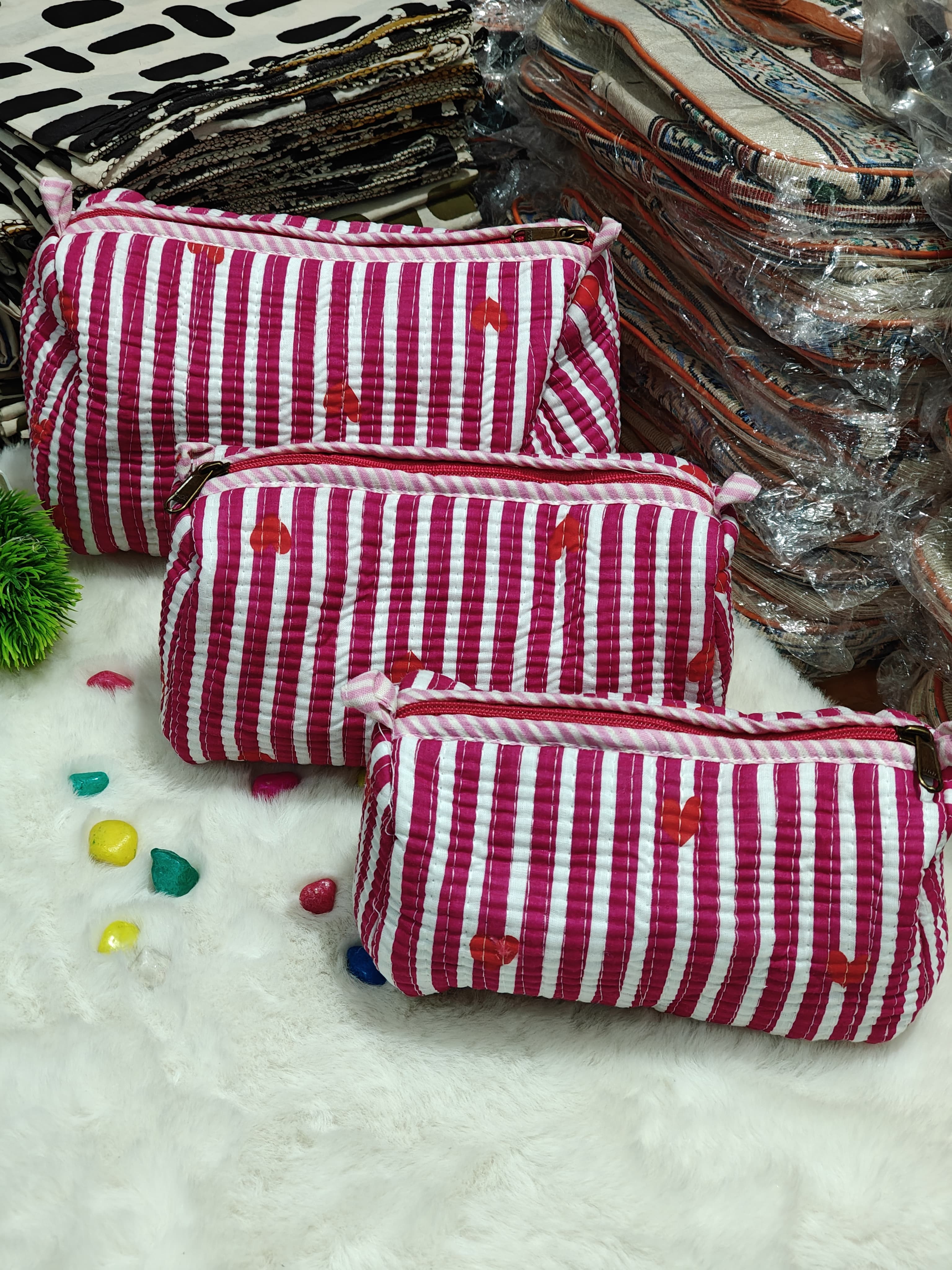 This set of three quilted cotton pouches is thoughtfully handcrafted to combine functionality with everyday elegance. Designed in three practical sizes, these pouches are perfect for organizing travel essentials or storing makeup, stationery, jewellery, and daily accessories.