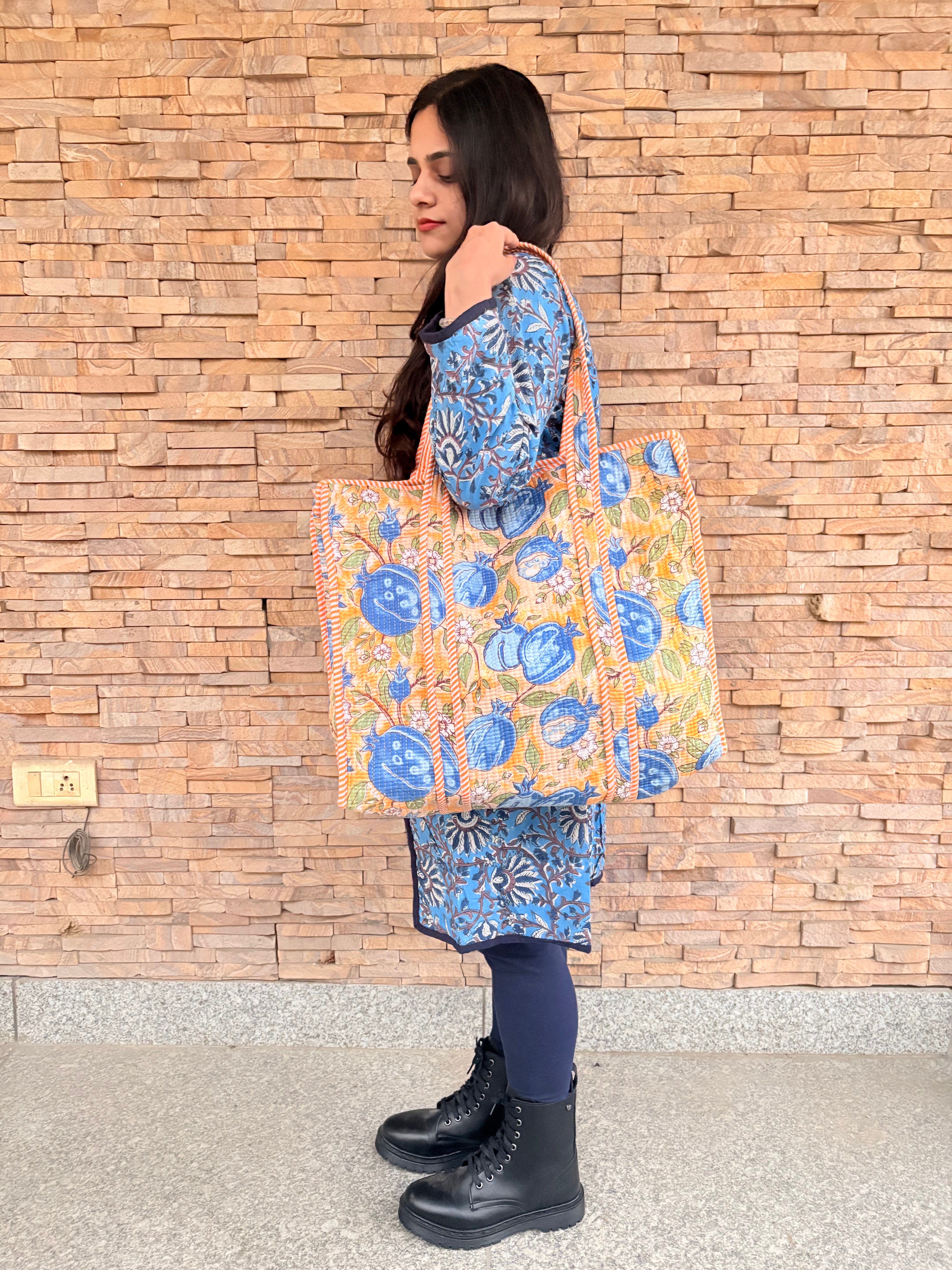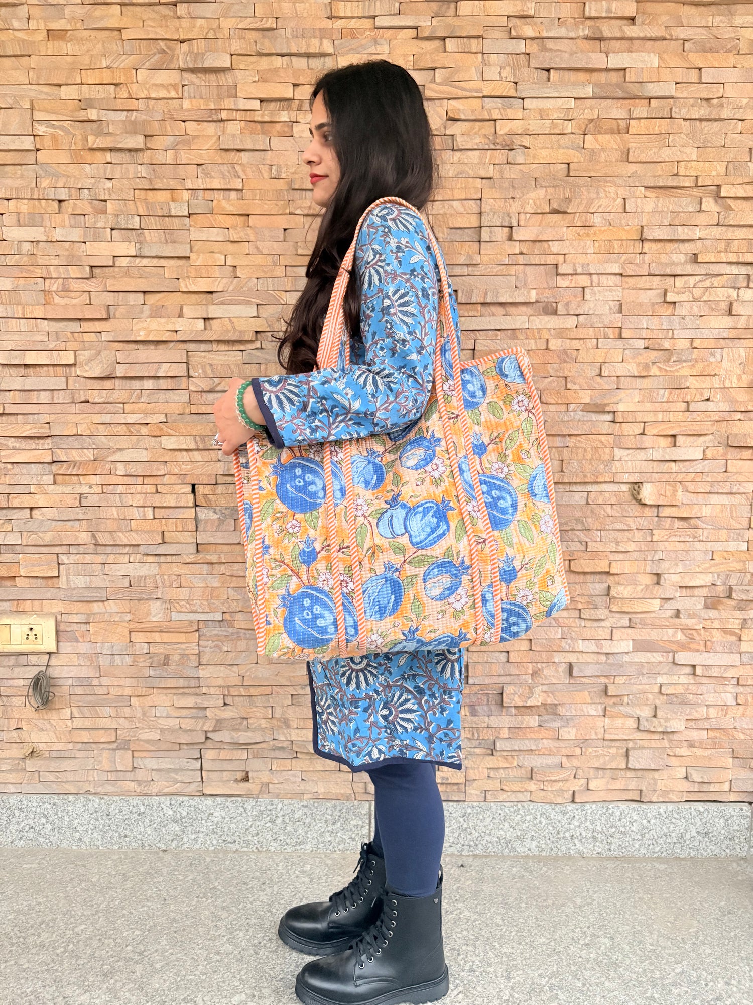 Finished with sturdy, comfortable handles, it’s perfect for workdays, casual outings, shopping runs, or short getaways. Crafted using traditional handblock printing, each tote carries a touch of artisanal beauty, making it as unique as your style.